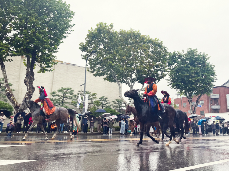 의복위에 우비를 입어 멋진 행차의 모습은 다소 아쉬움을 자아냈다.